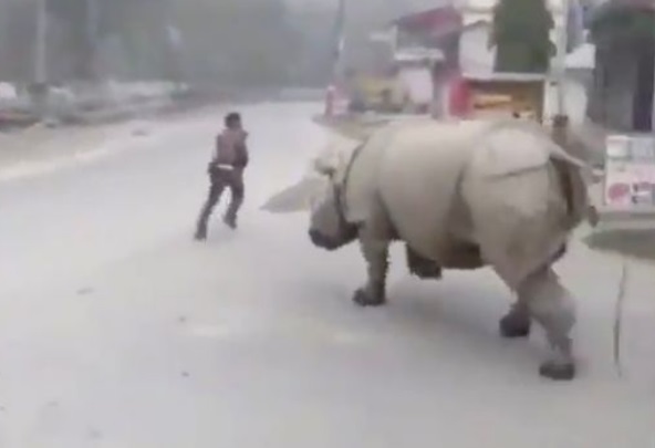 Em um vídeo compartilhado por um policial florestal indiano chamado Parveen Kaswan, o rinoceronte é visto patrulhando as ruas com o comércio fechado, e atacando um homem que tentou fingir que era parte da paisagem. Após dar um baita susto no coitado, voltou para a floresta. E que fique o aviso!
